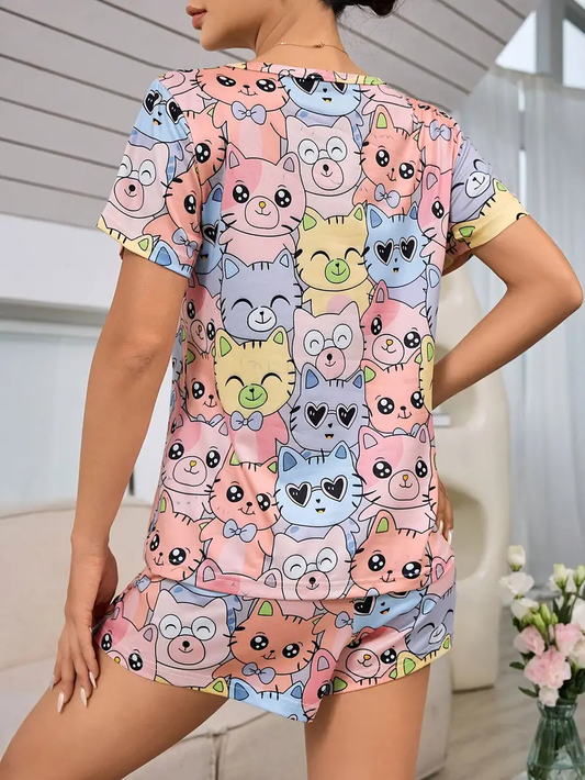 Women's White Cat Printed Co-Ord's Set In Pink Colour