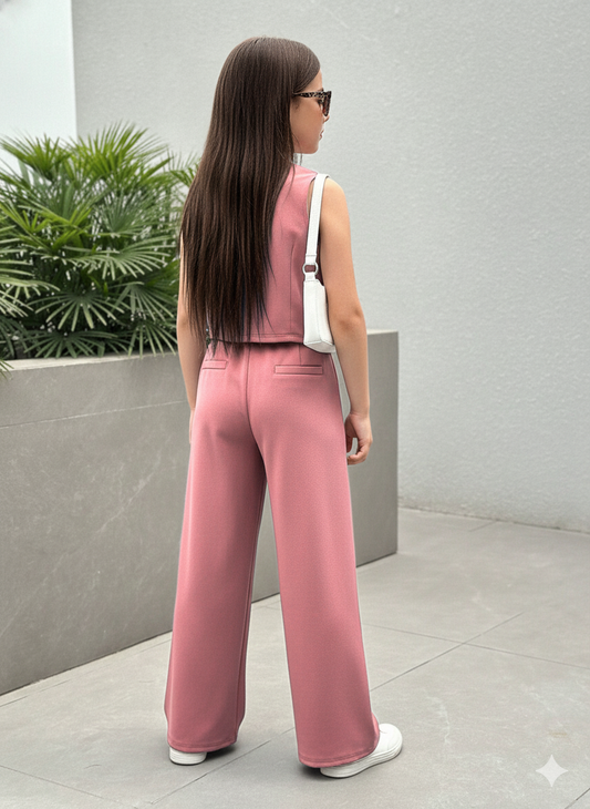 Girls Modern Solid Vest and Wide legs Pant Set ( Pink )