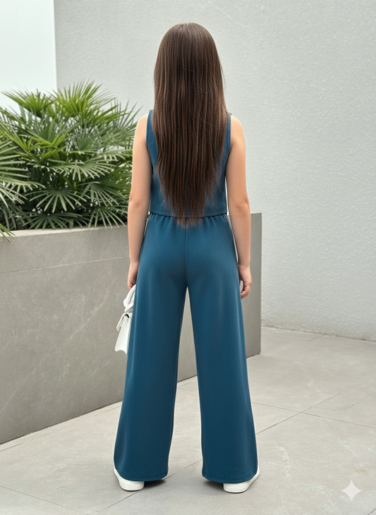 Girls Modern Solid Vest and Wide legs Pant Set ( Teal )