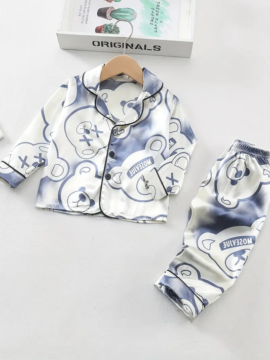 White Teddy Printed Unisex Nightsuit Set For Kids