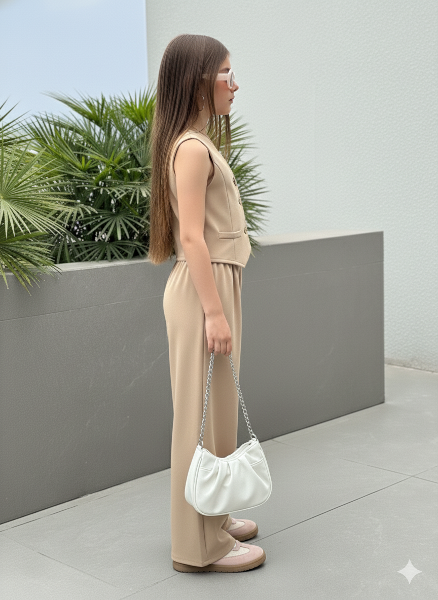 Girls Modern Solid Vest and Wide legs Pant Set ( Beige )